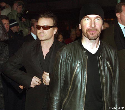 NEW YORK -- Leonardo DiCaprio (news), a smart little goatee on his handsome chin, beamed as he watched U2 perform, Bono's voice soaring to the rafters of the New York Public Library as he sang The Hands That Built America.
